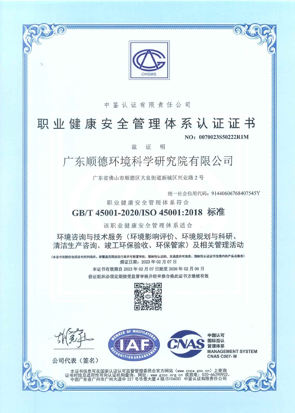 • ISO45001職業健康安全管理體系認證證書